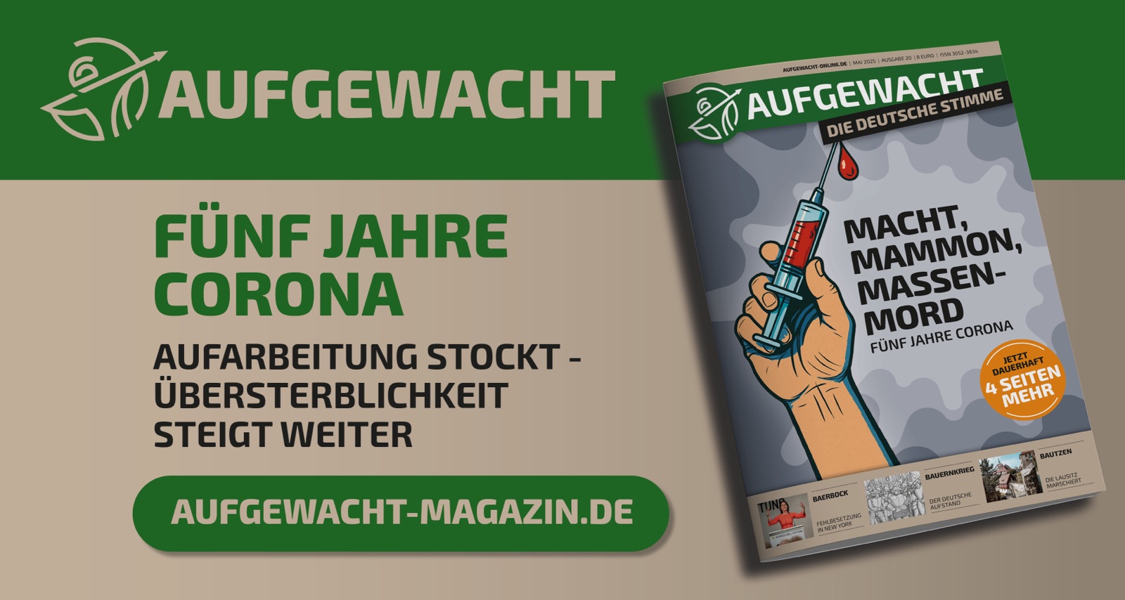 AUFGEWACHT – Die Deutsche Stimme ist ein aufstrebendes Monatsmagazin für Patrioten, das kein Blatt vor den Mund nimmt. Die aktuelle Ausgabe widmet sich dem traurigen 5-Jahres-Jubiläum der Corona-Zwangsmaßnahmen und zeigt auf, wie die Polit-Täter von damals ungestraft davonkommen konnten. Auch sonst setzt AUFGEWACHT Maßstäbe und deckt die Machenschaften der Kartellparteien schamlos auf.